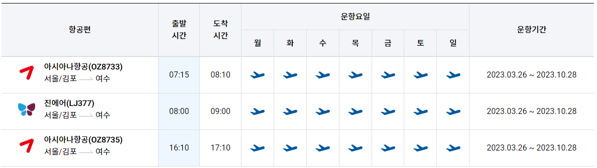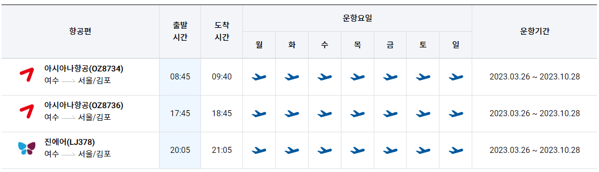 김포공항→여수공항 운항 비행기 시간표 (2023년 10월 28일까지)