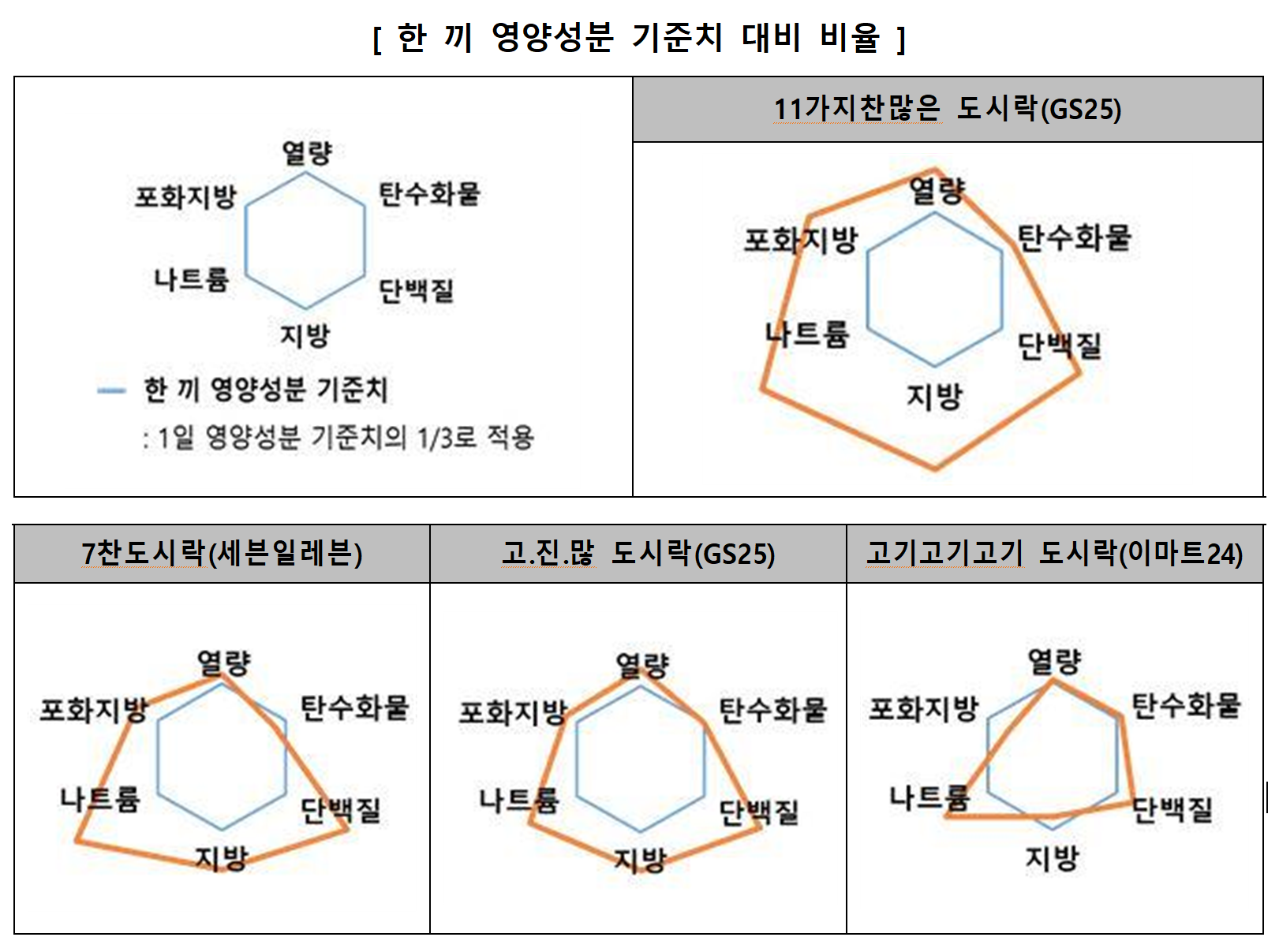 이마트24 편의점 도시락 '푸짐한 제육&불고기 도시락'과 이마트24 편의점 도시락 '고기 고기 고기 도시락'이 한 끼 영양성분 기준치에 가장 적합해 보입니다.(아래 그림 참조)