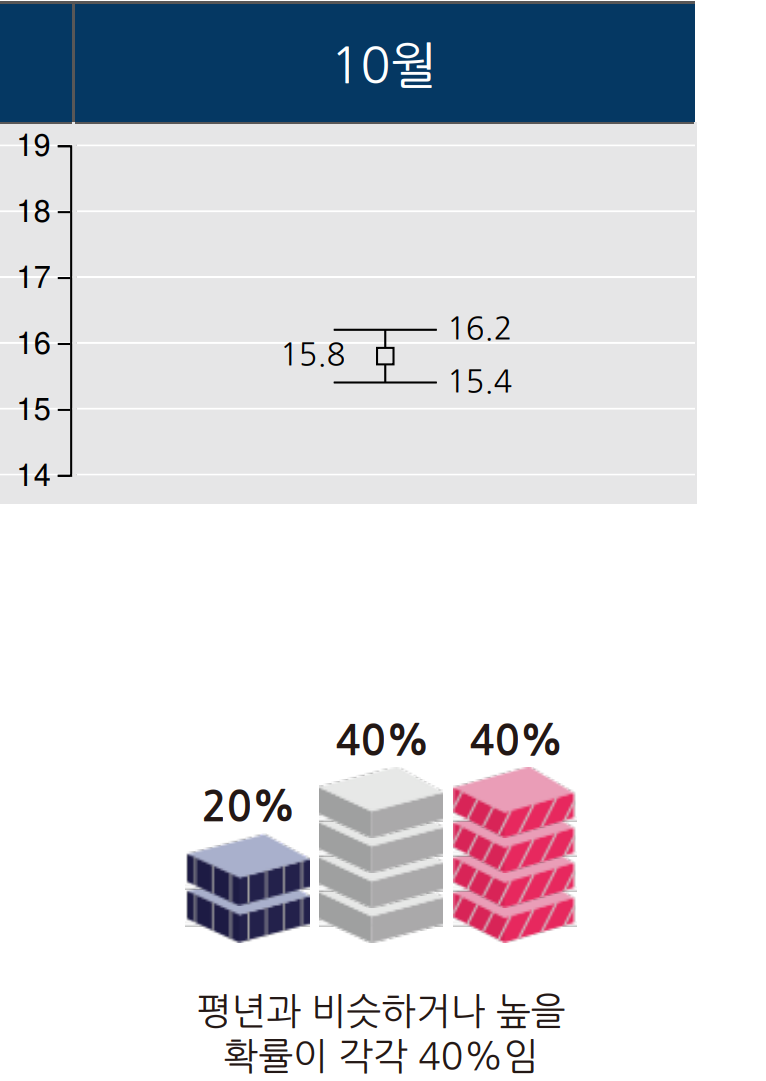 (월평균기온) 평년(15.4~16.2℃)과 비슷하거나 높을 확률이 각각 40%입니다.