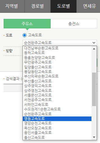 4. 고속도로 세부노선 선택에서 '영동고속도로' 찾아서 누르기