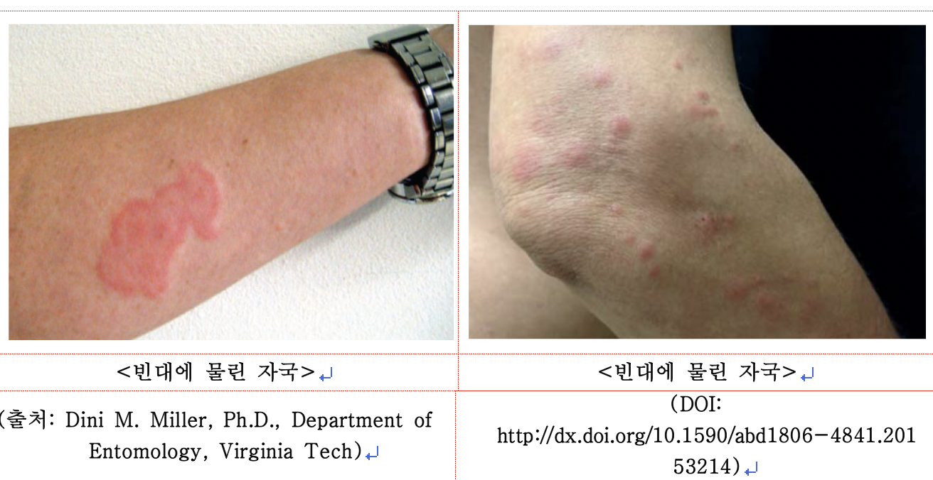 ▷ 모기 물린 것과 비슷하나, 주로 옷에 가려지지 않은 팔, 손, 목, 다리 등 노출 부위를 물며, 혈관을 잘 찾지 못해서 2~3곳을 연달아 물어 일렬이나 원형으로 자국이 생김(아래 사진 참고)