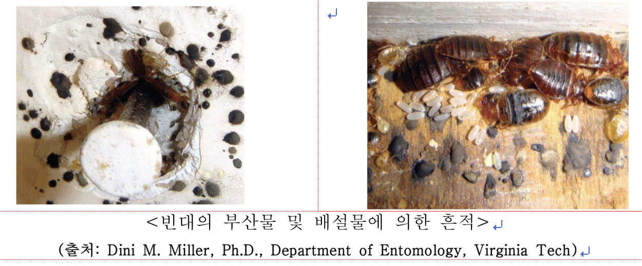 ▷ 침대의 매트리스 패드를 들어 올리고 침대 모서리나 커버의 주름진 곳을 확인하여 적갈색의 빈대 배설물이나 빈대가 눌러져 죽으면서 묻힌 혈흔 또는 알껍질(난각)이나 탈피 허물 등을 찾을 수 있음 (아래 사진 참고)