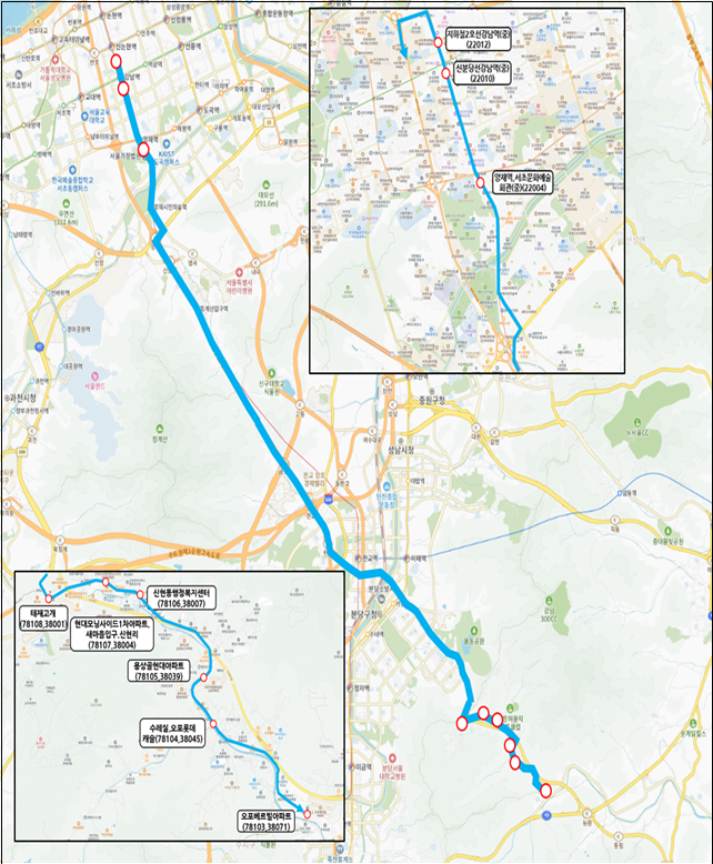광주시 오포베르빌아파트 → 수레실 오포롯데캐슬 → 용상골 현대아파트 → 신현동 행정복지센터 → 현대모닝사이드1차아파트.새마울입구.신현리 → 태재고개 → 양재역.서초문화예술회관(중) → 신분당선강남역(중) → 지하철2호선강남역(중)