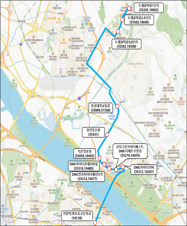 고양시 도래울마을 1단지 → 도래울마을 2,3단지 → 도래울마을 5,6단지 → 항공대학교동문 → 현천동난점 → 덕은양묘장 → DMC자이더포레리버뷰 → DMC한강자이더헤리티지 → 삼정그린코아더베스트.DMC디에트르한강 → DMC자이더리버 → 가양역.마포중고등학교