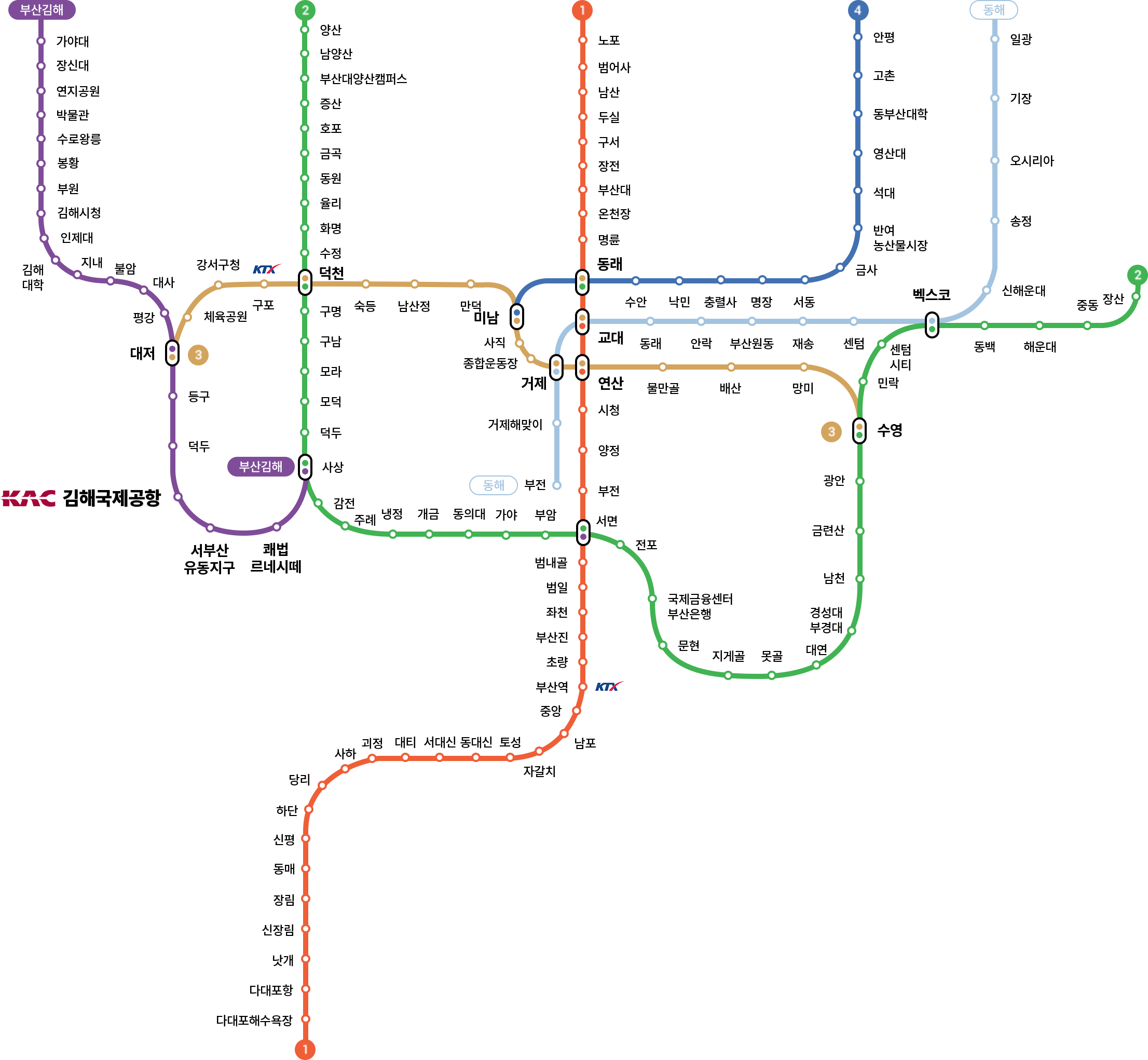 아래 부산 지하철 노선도를 보시면 쉽게 확인이 가능합니다.