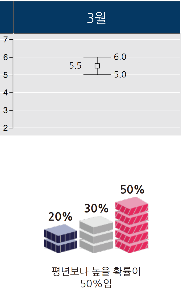-(월평균기온) 평년(5.0~6.0℃)보다 높을 확률이 50%입니다.