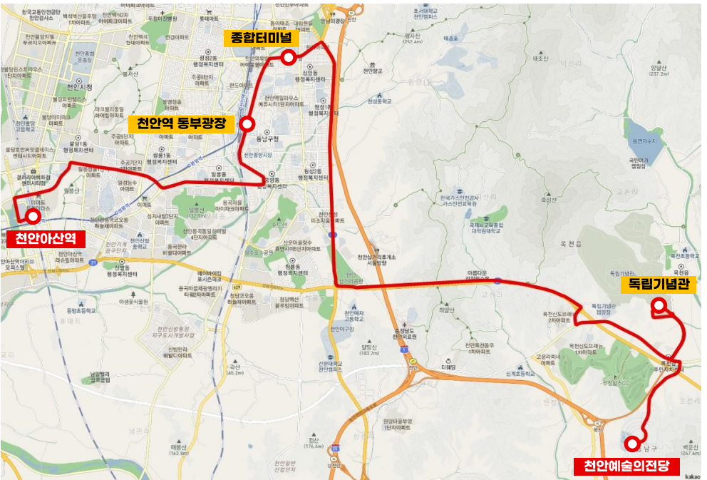 이제부터 천안아산역-천안역-천안터미널-독립기념관 사이 운행 버스 정보를 알아볼까요?