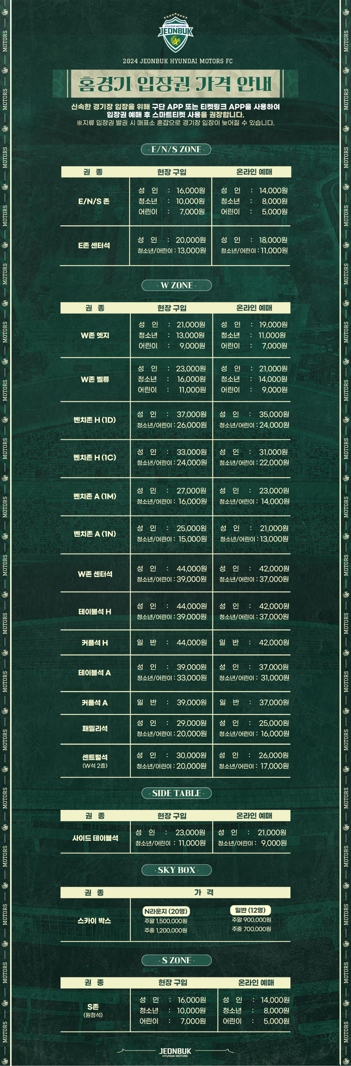 2024 시즌 전북 현대 홈경기장 전주월드컵경기장 좌석별 입장권 티켓 가격