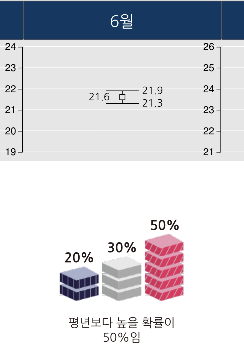 -(월평균기온) 평년(21.3~21.9℃)보다 높을 확률이 50%입니다.