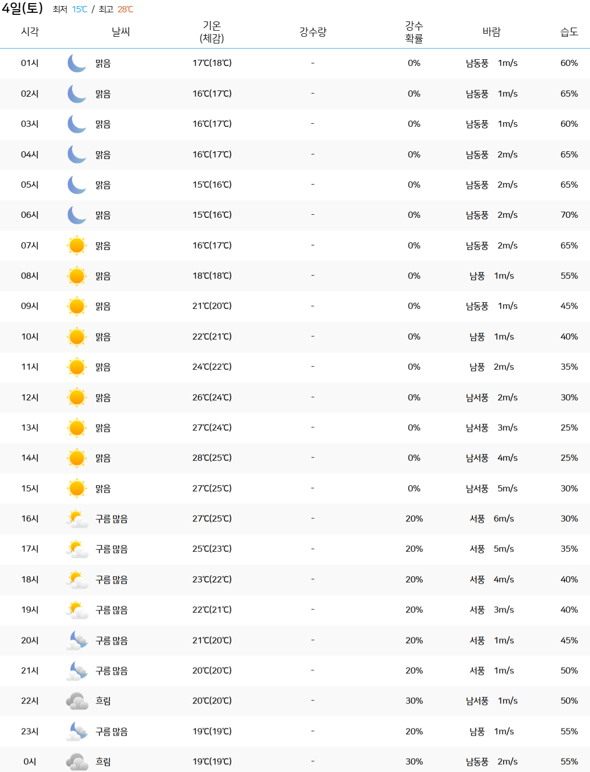 2024년 5월 4일 서울 시간대별 날씨 예보