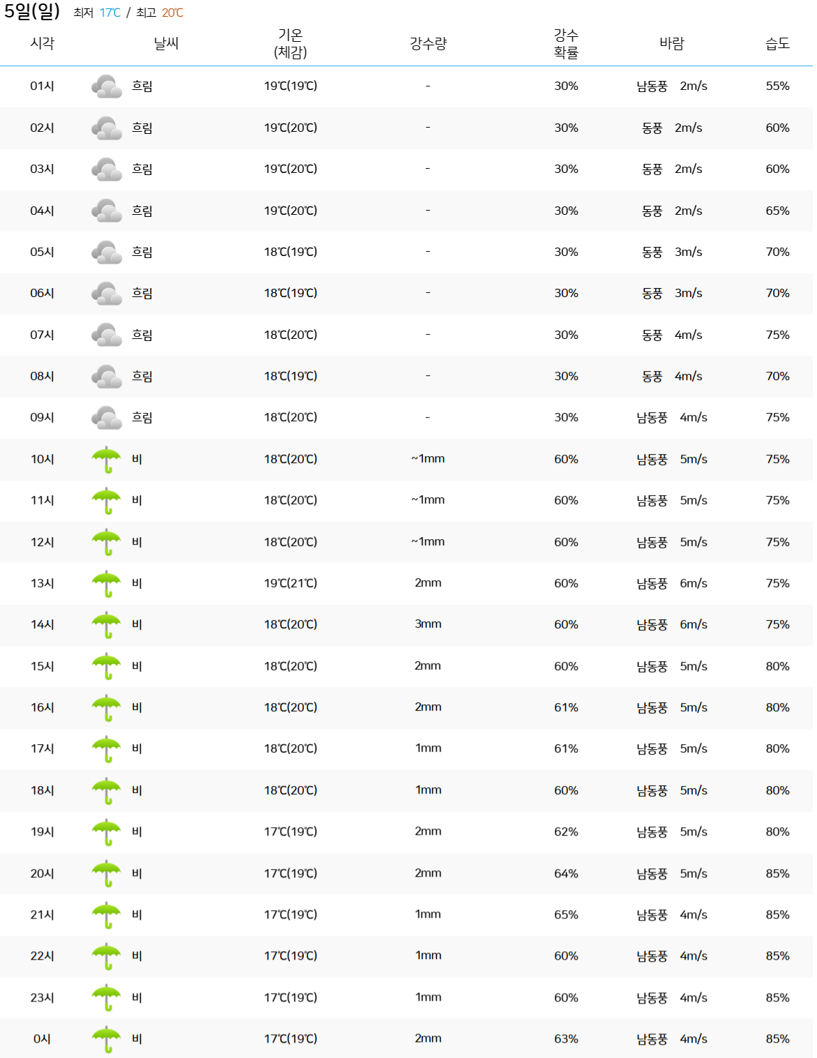 2024년 5월 5일 서울 어린이날 시간대별 날씨 예보