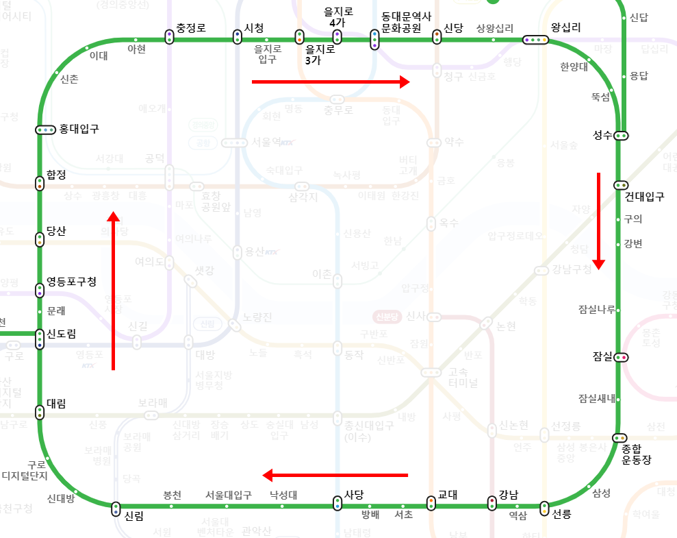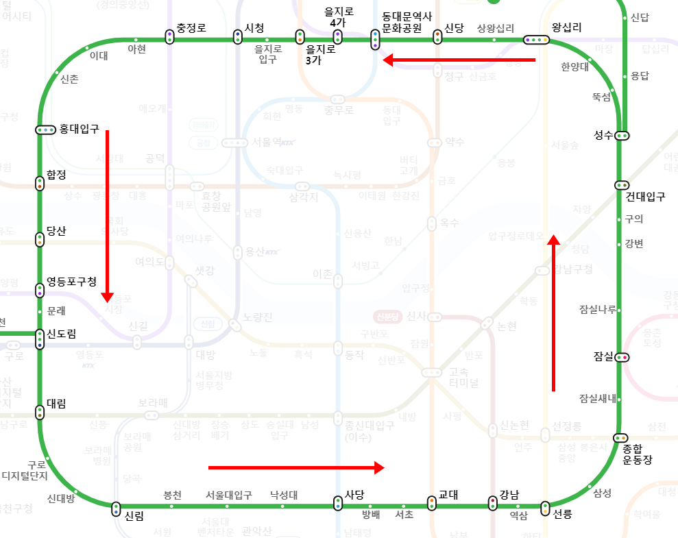 아래 노선도에 그려진 화살표 방향으로 운행하는 2호선이 순환외선 노선입니다.
