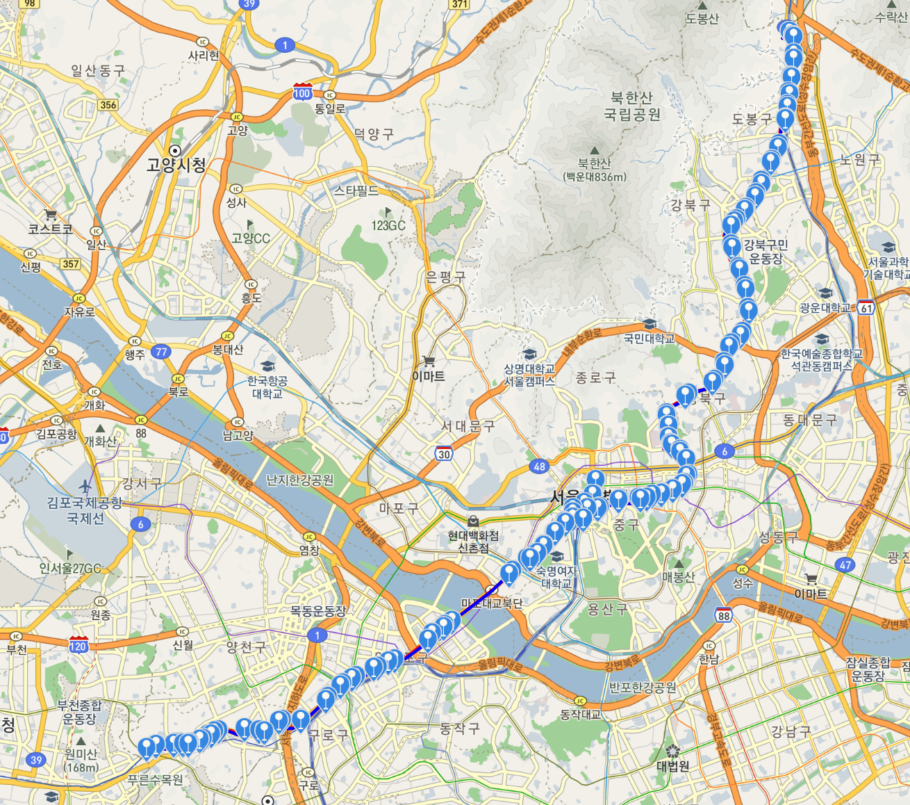 [서울 N16번] 도봉산역광역환승센터 → 온수동 종점 정류장 순서