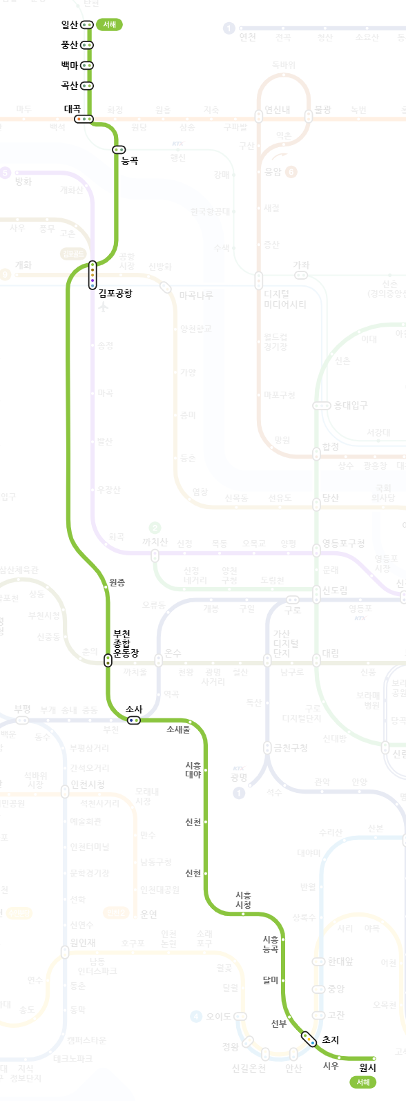 일산역 ↔ 풍산역 ↔ 백마역 ↔ 곡산역 ↔ 대곡역 ↔ 능곡역 ↔ 김포공항역 ↔ 원종역 ↔ 부천종합운동장역 ↔ 소사역 ↔ 소새울역 ↔ 시흥대야역 ↔ 신천역 ↔ 신현역 ↔ 시흥시청역 ↔ 시흥능곡역 ↔ 달미역 ↔ 선부역 ↔ 초지역 ↔ 시우역 ↔ 원시역