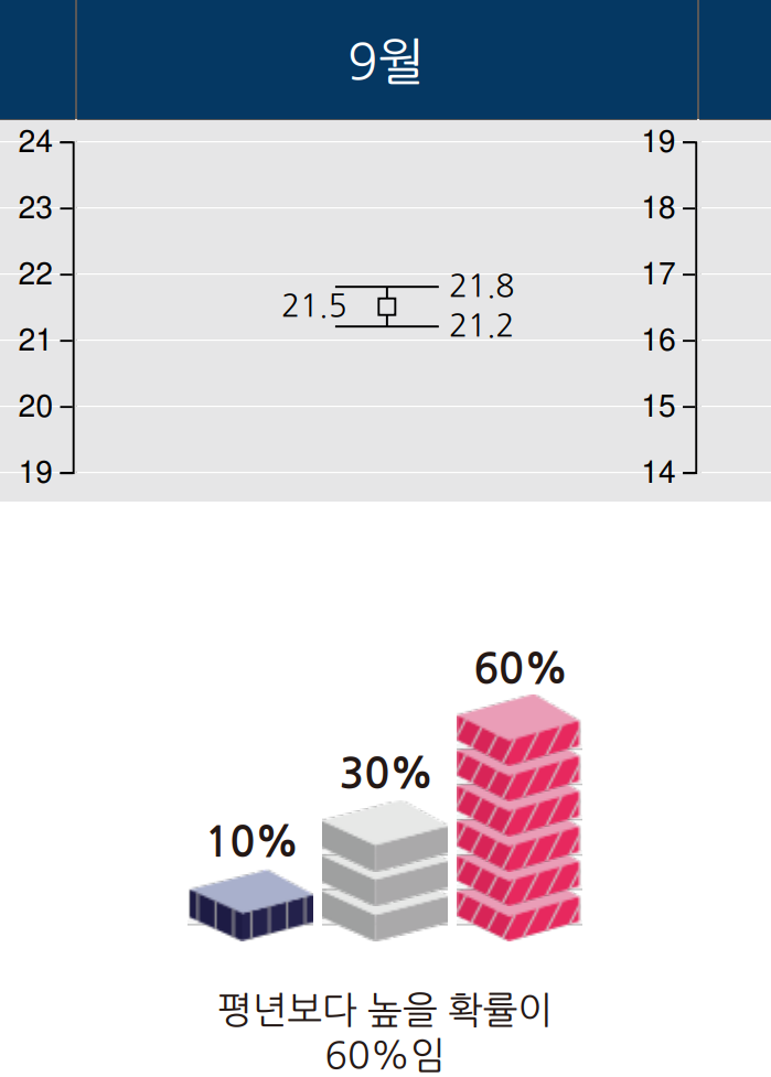 ▶ (월평균기온) 평년(21.2~21.8℃)보다 높을 확률이 60%입니다.