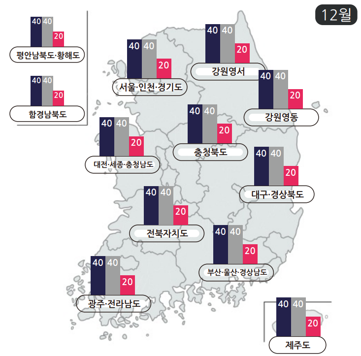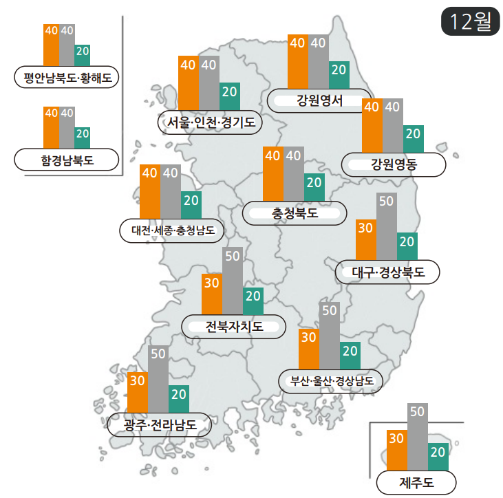 - 평년 12월 기온과 비슷하거나 낮을 것으로 예보되었습니다.