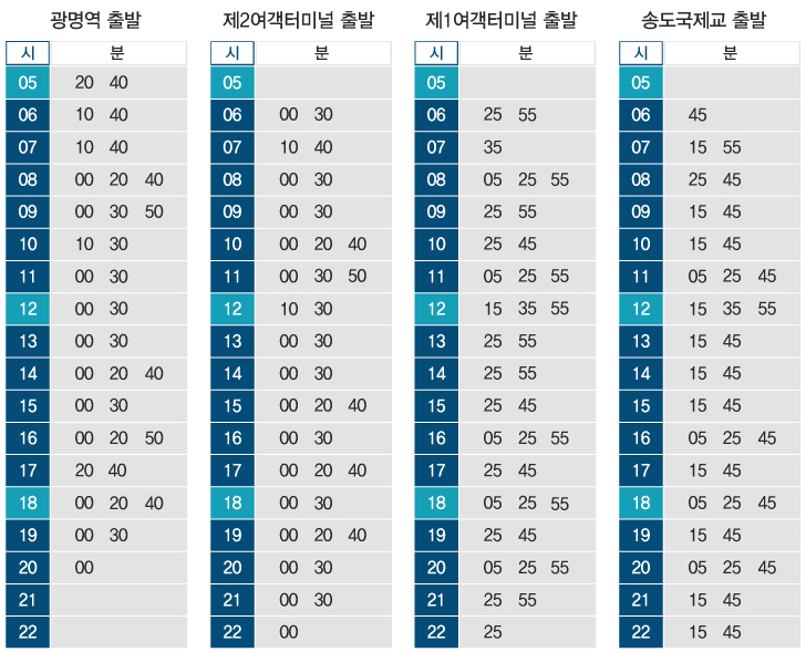 | 구분 | 광명역↔인천공항 | 인천공항↔송도국제교 | 송도국제교↔광명역 |