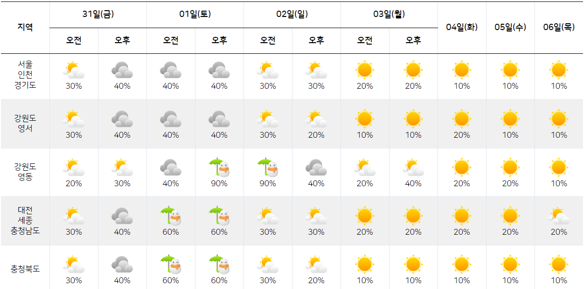 | 지역 | 31일 (금) |