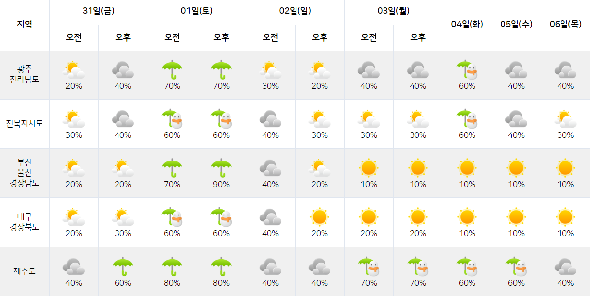 | 제주도 | 흐리고 비/눈 60% |