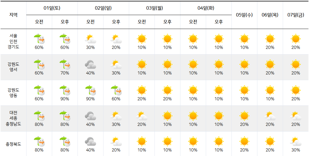 - 2월 5일 ~ 2월 7일 전국 지역별 날씨 예보