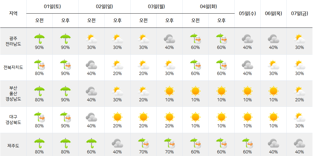 | 제주도 | 흐리고 비/눈 70% |