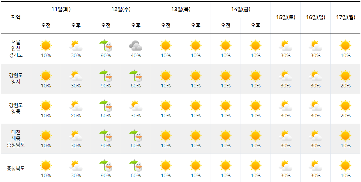 | 지역 | 2월 11일(화) | 2월 12일(수) | ||