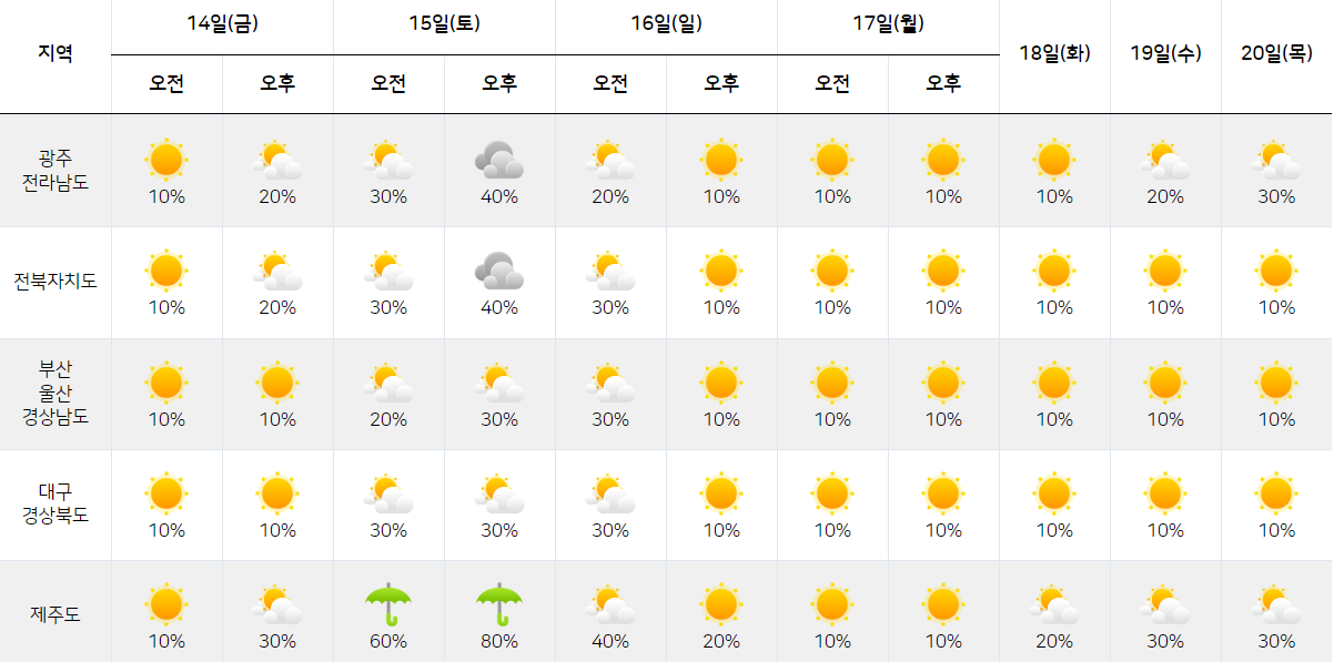| 제주도 | 맑음 10% |
