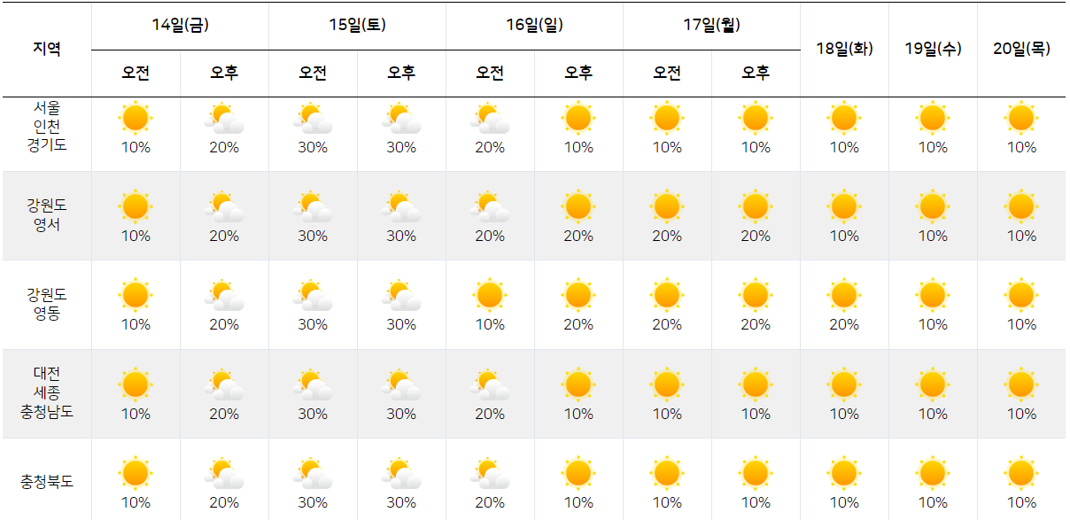 | 지역 | 14일 (금) |