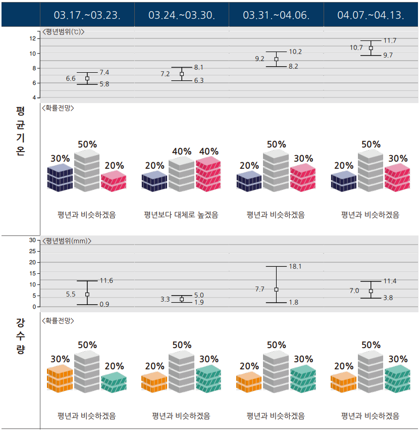 -(주평균기온) 평년(5.8~7.4℃)과 비슷할 확률이 50%입니다.