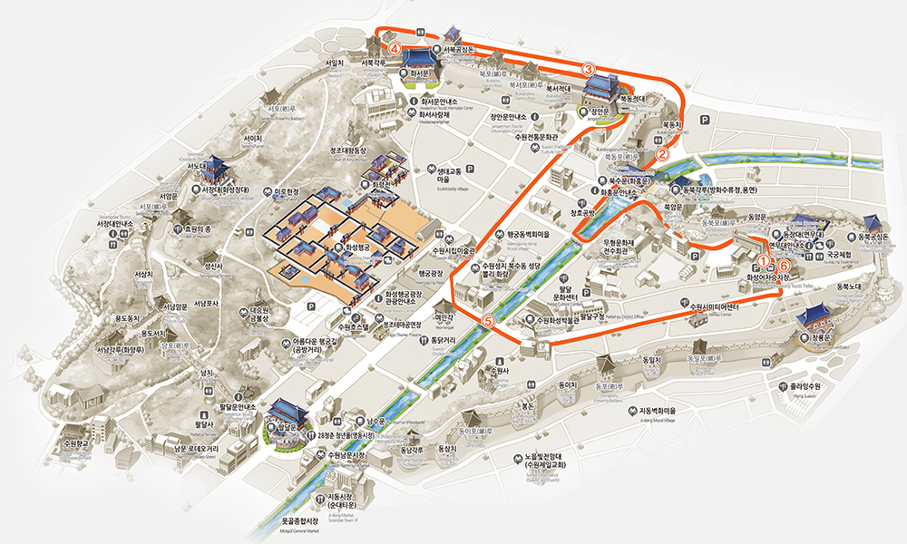 ① 연무대 → ②화홍문(하차가능) → ③장안문 → ④화서문(하차가능) → ⑤매향교(하차가능) → ⑥연무대