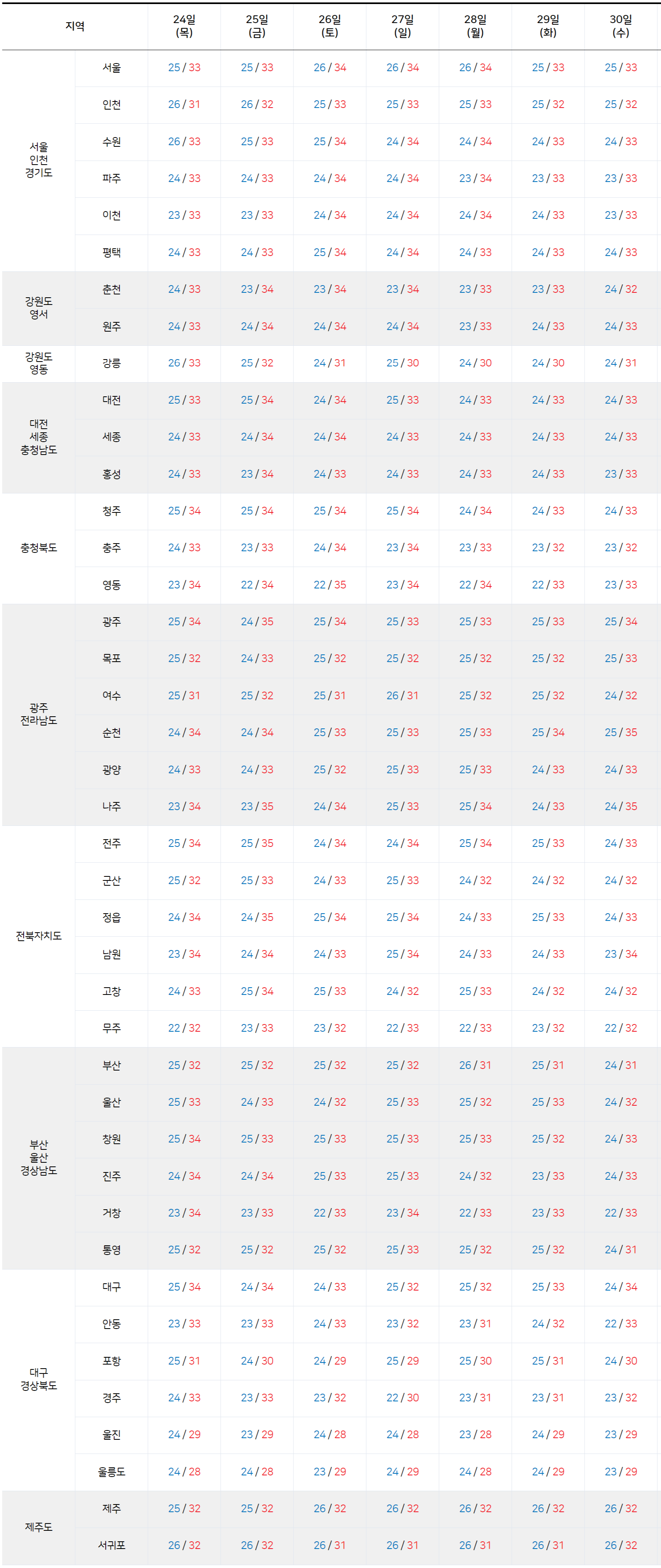 2025년 7월 24일 ~ 7월 30일 전국 기온 예보