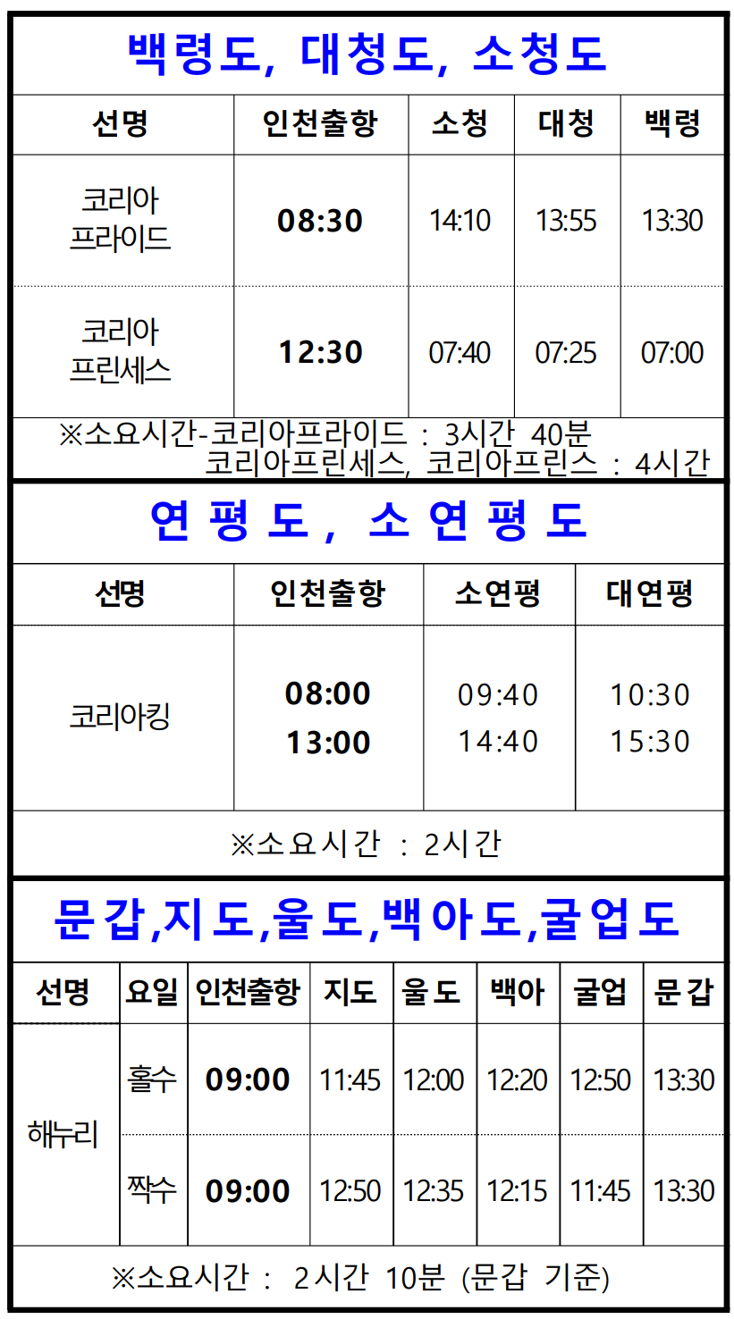 - 백령도 대청도 소청도 연평도 소연평도 문갑도 지도 울도 백야도 굴업도 운항 시간표