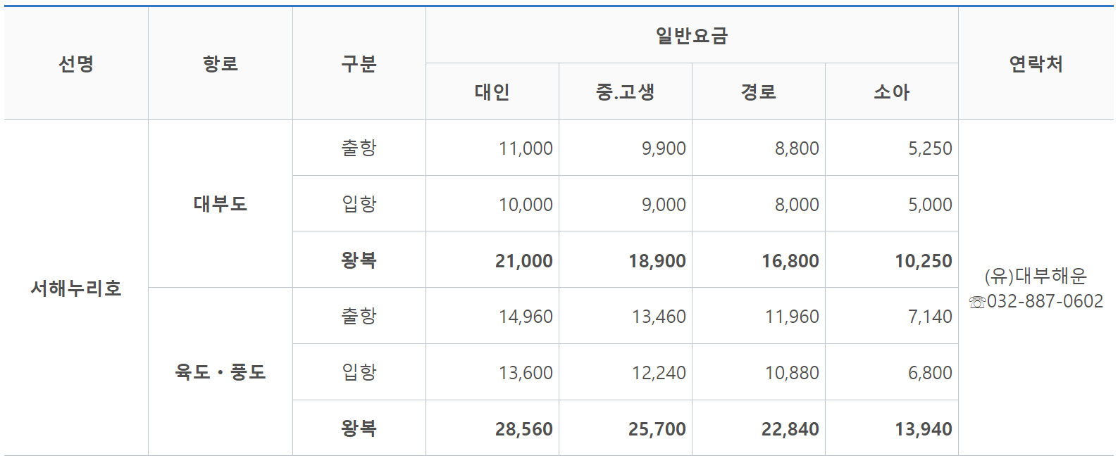 - 대연평도 소연평도 여객선 요금
