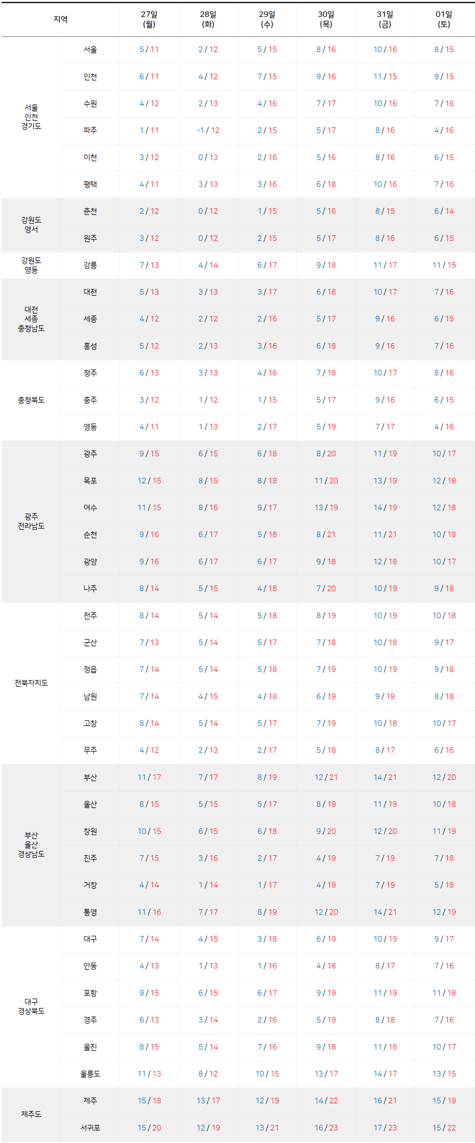 - 2025년 10월 27일 ~ 11월 1일 전국 기온 예보