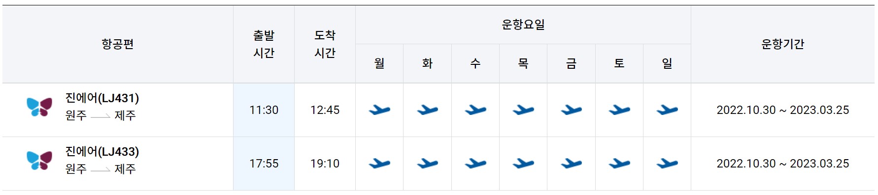 <제주공항 → 원주공항 진에어 비행기 출발 시간 도착 시간 스케줄>