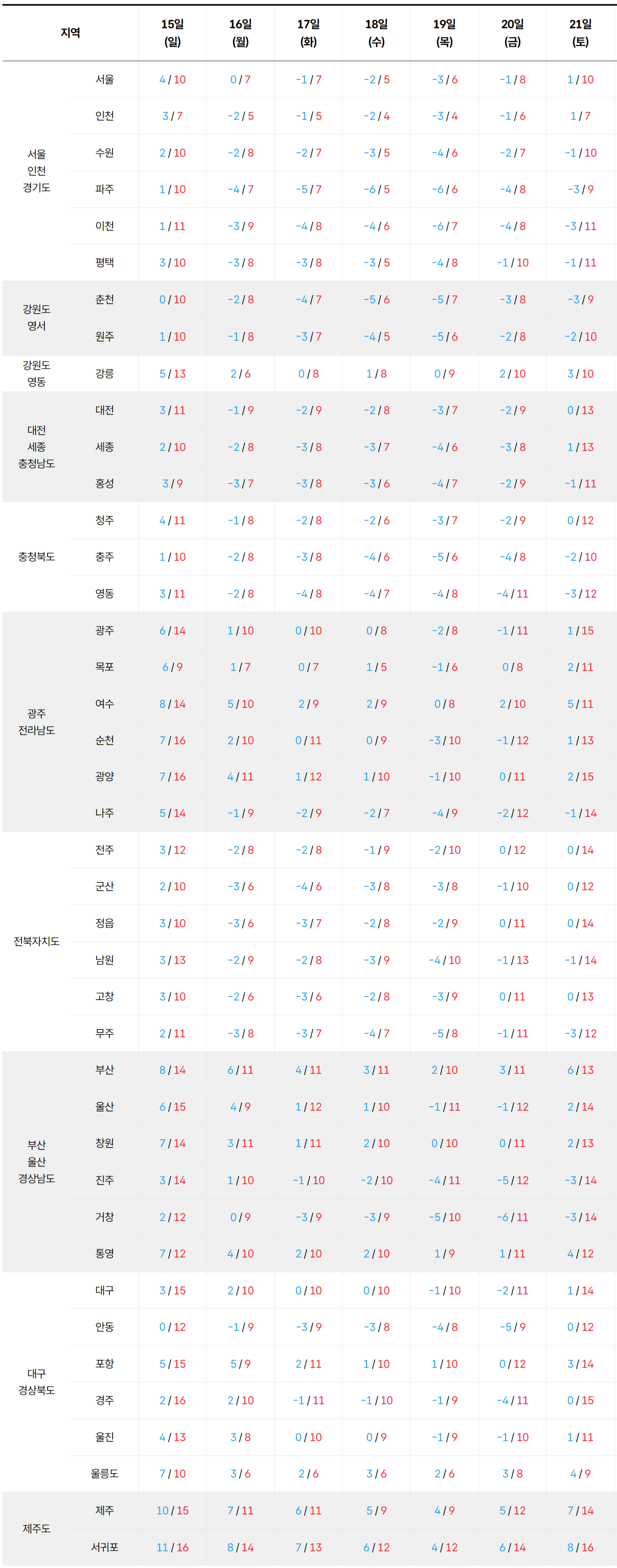 - 2026년 2월 15일 ~ 2월 21일 전국 기온 예보