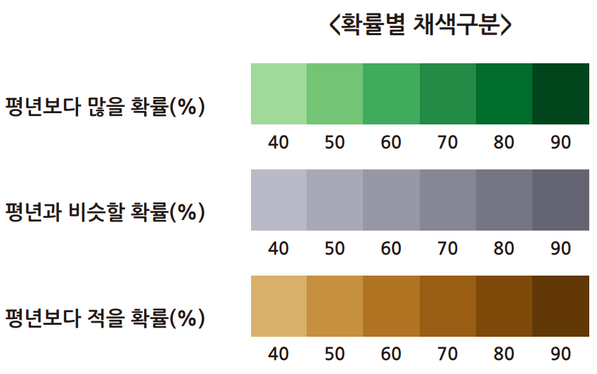 갈색이 진할수록 평년 강수량보다 을 확률이 높습니다.